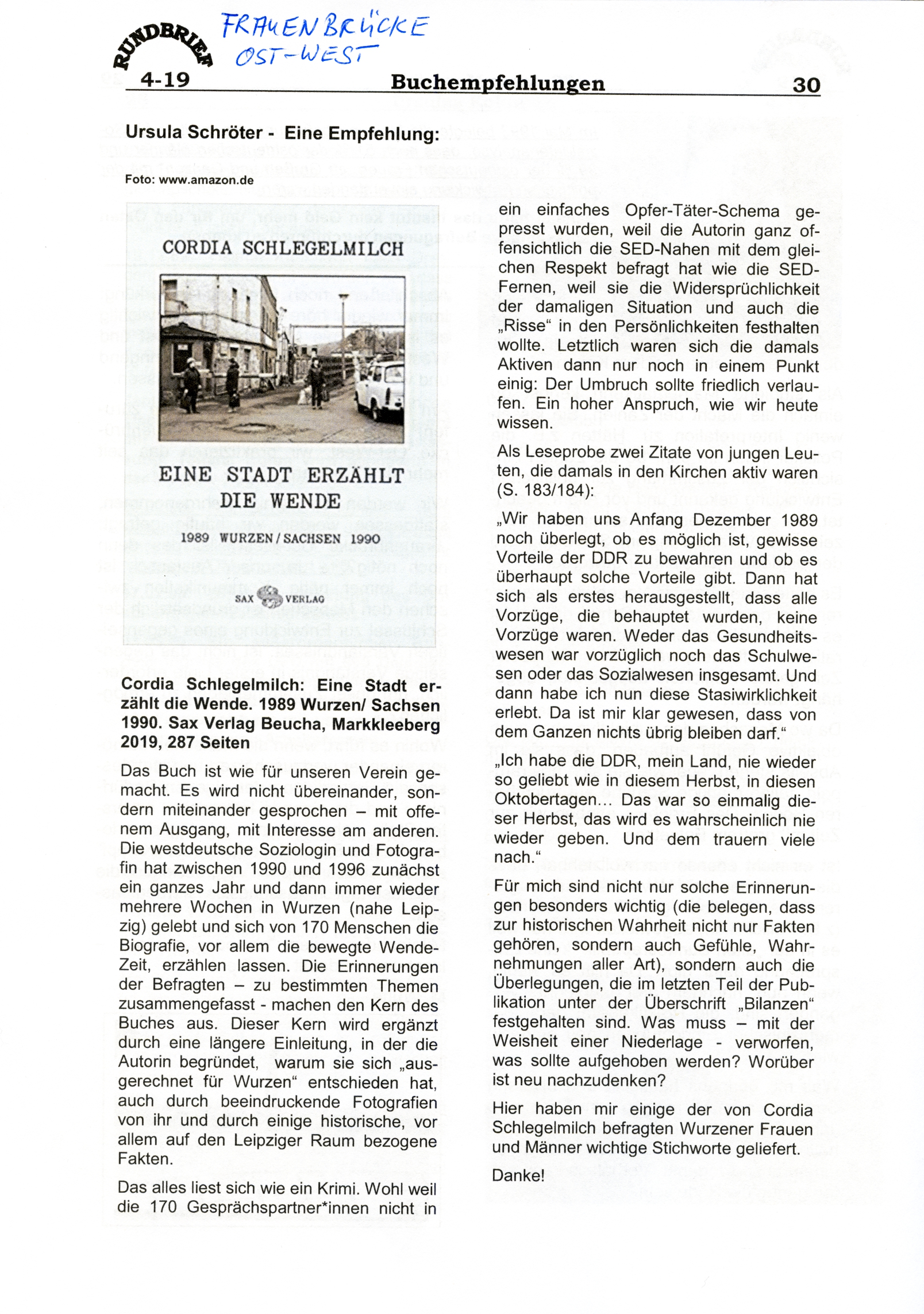 „Eine Stadt erzählt die Wende – 1989 Wurzen/Sachsen 1990 –" Beucha-Markkleeberg: Sax Verlag 2019.